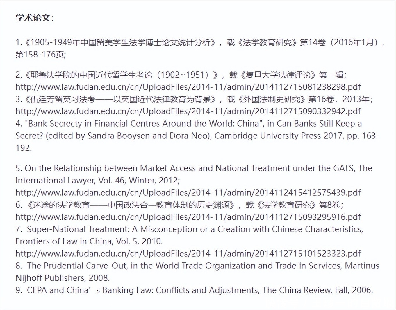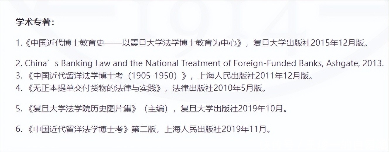 他发表了《1905-1949年中国留美学生法学博士论文统计分析》《伍廷芳留英习法考——以英国近代法律教育为背景》《迷途的法学教育——中国政法合一教育体制的历史渊源》等学术论文。出版了《中国近代博士教育史——以震旦大学法学博士教育为中心》《中国近代留洋法学博士考》《无正本提单交付货物的法律与实践》等学术著作。