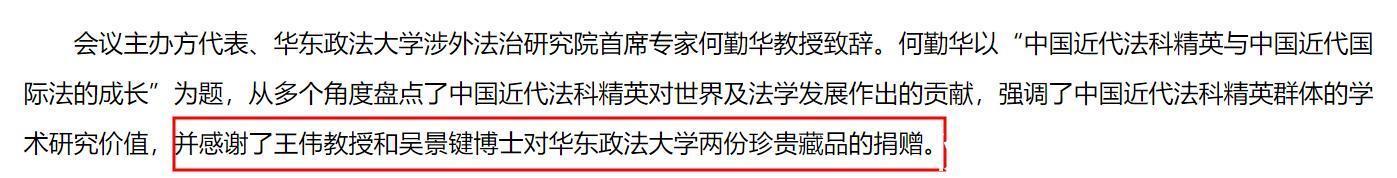 就在去年7月,王伟教授还参加了在华东政法大学举行的学术论坛,他当时还向母校捐赠了珍贵藏品。
