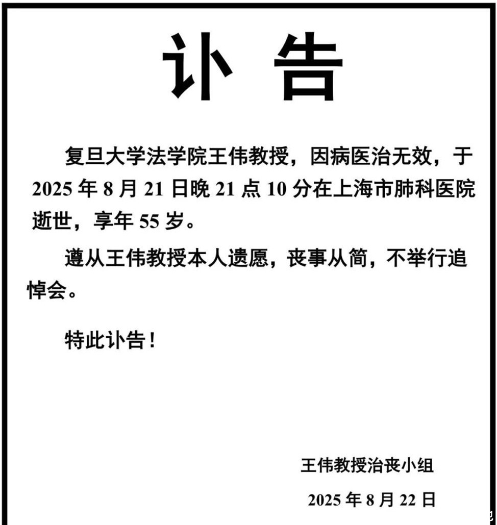 如今复旦大学法学院的王伟教授也被曝去世了,年仅55岁。